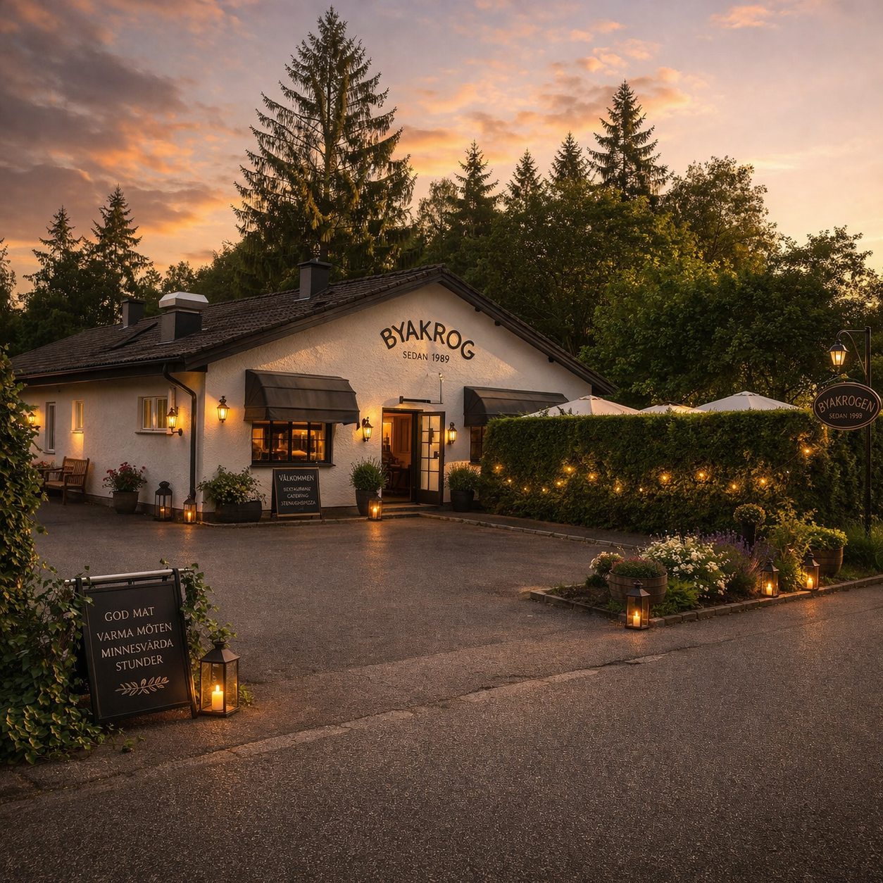 God mat i varm och lantlig miljö. Njut av lunch, kvällsservering och helgens favoriter i vår ombonade Byakrog. Varmt välkommen!